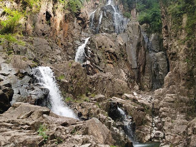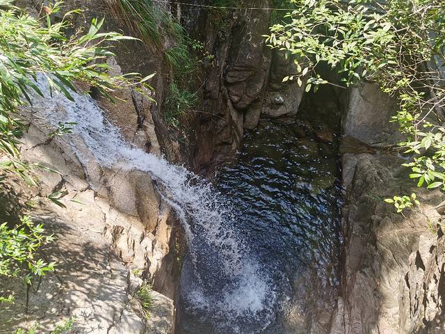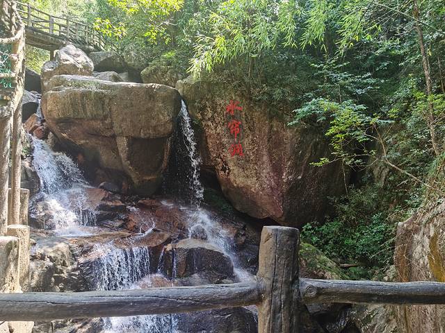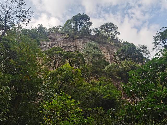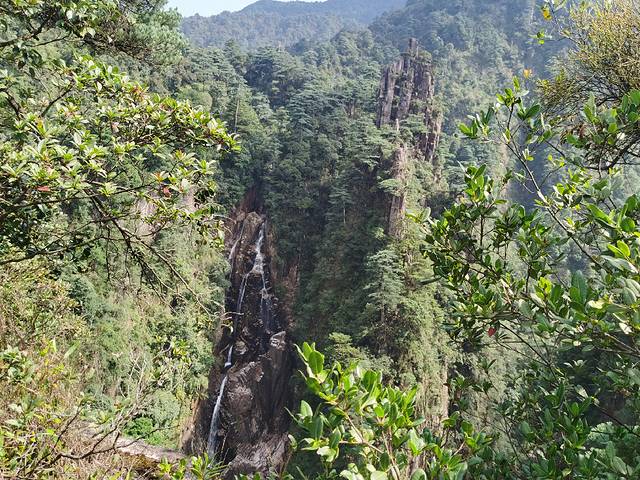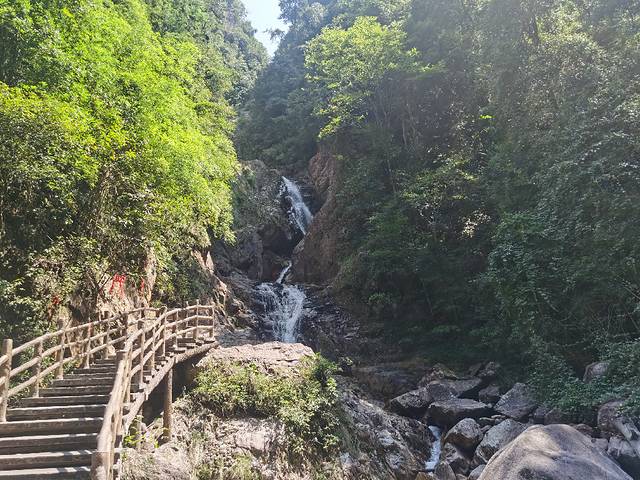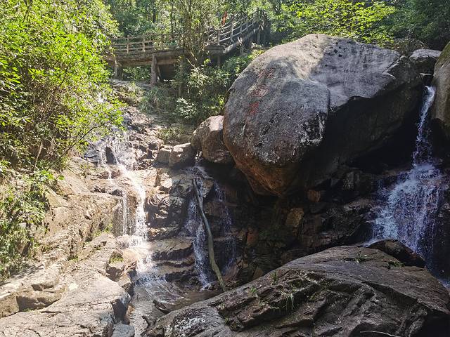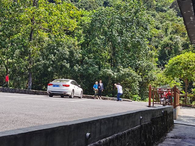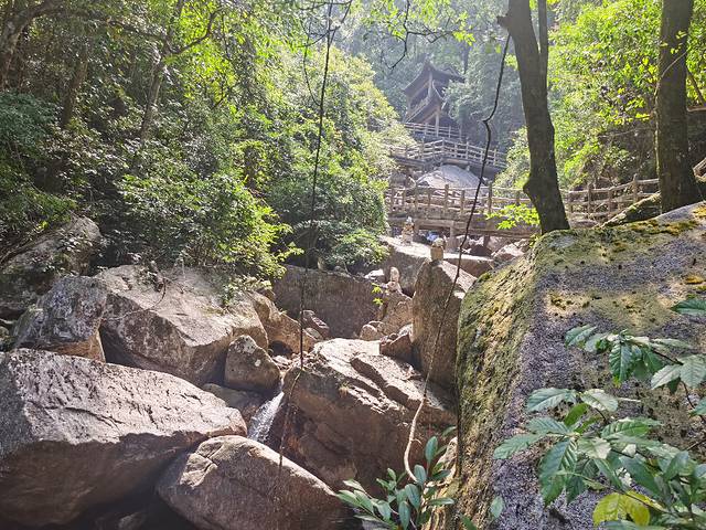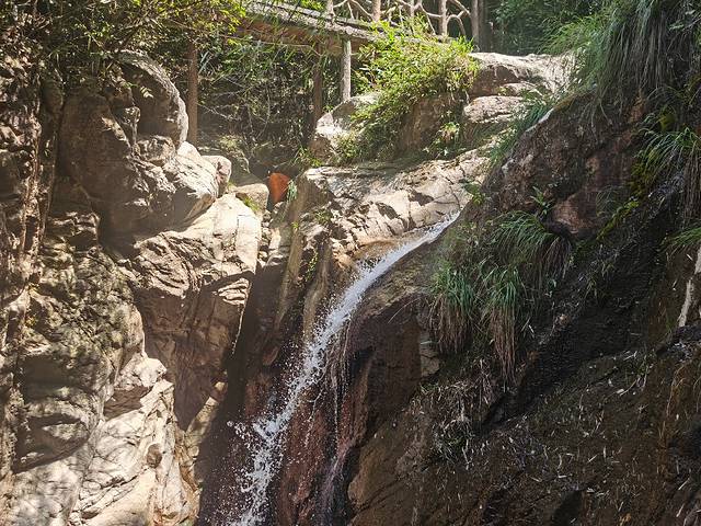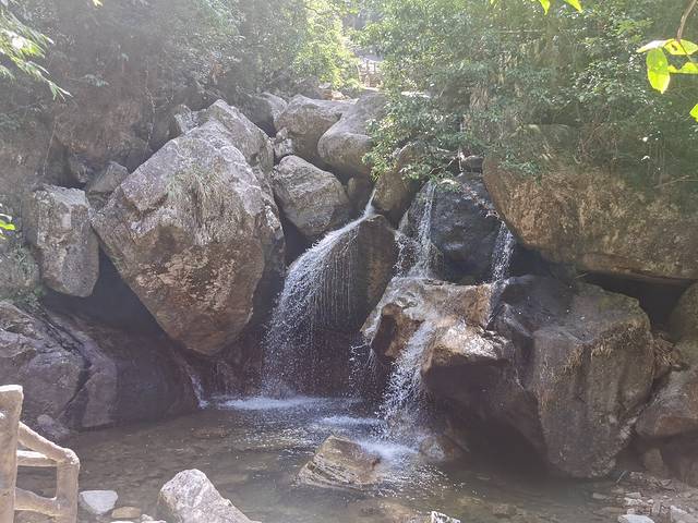 猴面瀑下还有一处水帘洞,显然也是为了呼应猴王这个名字。来到溪流的源头处,抬头仰望,只见一条白色的绸缎悬挂在陡峭的山谷之间,在绿树的掩映下若隐若现,此处名为九叠泉,但到底有没有九叠,实在难以分辨。旁边还建有九叠亭,闲坐于亭中,可倾听大自然的天籁之音。