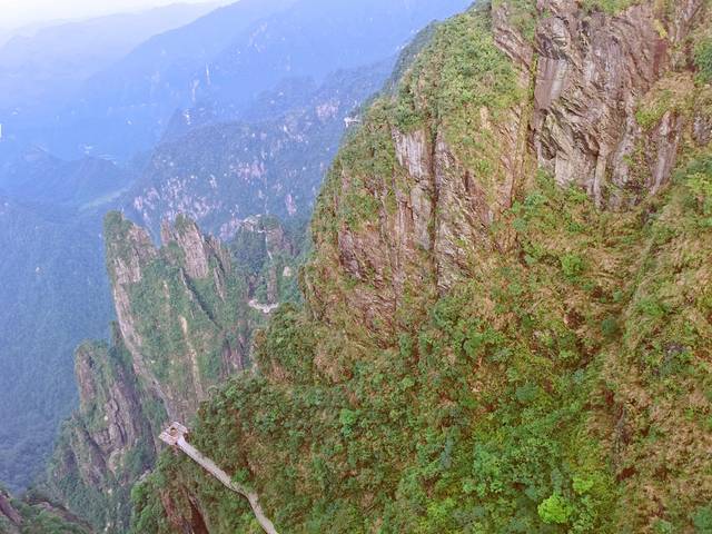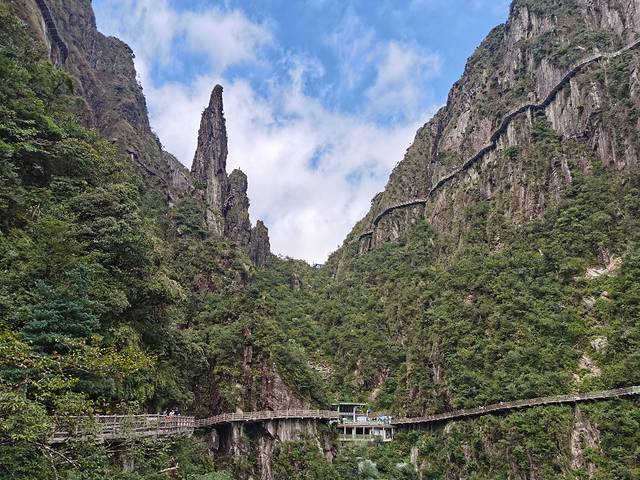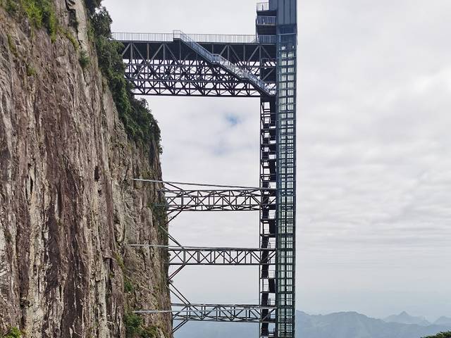 这里本来是没有路的,人们硬是在悬崖绝壁之上,开凿出两重栈道,然后修筑台阶,将两重栈道连接起来,形成一个游览环线,在此游玩,堪称是飞檐走壁。既然号称无障碍景区,自然有其特别之处,在上下两层栈道之间,搭建了两部垂直电梯,一部位于摩天岭,高达140米,一部位于小 天台 ,高达120米,当然,使用时需要另外付费。