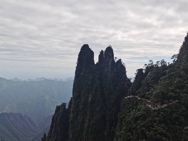 我们则抱着试试看的心理,继续前进。越往上山风也就越大,吹在身上凉飕飕的,身上的夏装显然无法抵御这凛冽的寒风。很快就来到山顶的观景平台,从这里可俯瞰五指峰景区全貌,果然是风光无限。这座观景平台搭建在山顶之上,更显险峻,很多怕高的人,还没上去腿就开始抖了。
