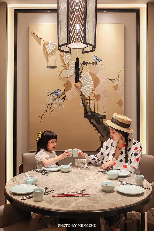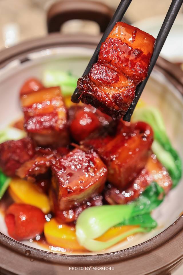 餐厅的环境优雅古典,转角隔栏处皆是风景。一定不要错过主厨的看家菜“古法醋焖红烧肉”,五层五花肉,配以花雕酒和四种醋炖制,再点缀山楂,打底南瓜,让这道红烧肉鲜嫩多汁,软糯酸甜,令人回味无穷。捞汁乳瓜丝是非常清爽的开胃前菜,搭配了藜麦带来更丰富的口感;清炒时蔬里的山药特地先烤过再炒,小小细节可见大厨的用心和专业水准。