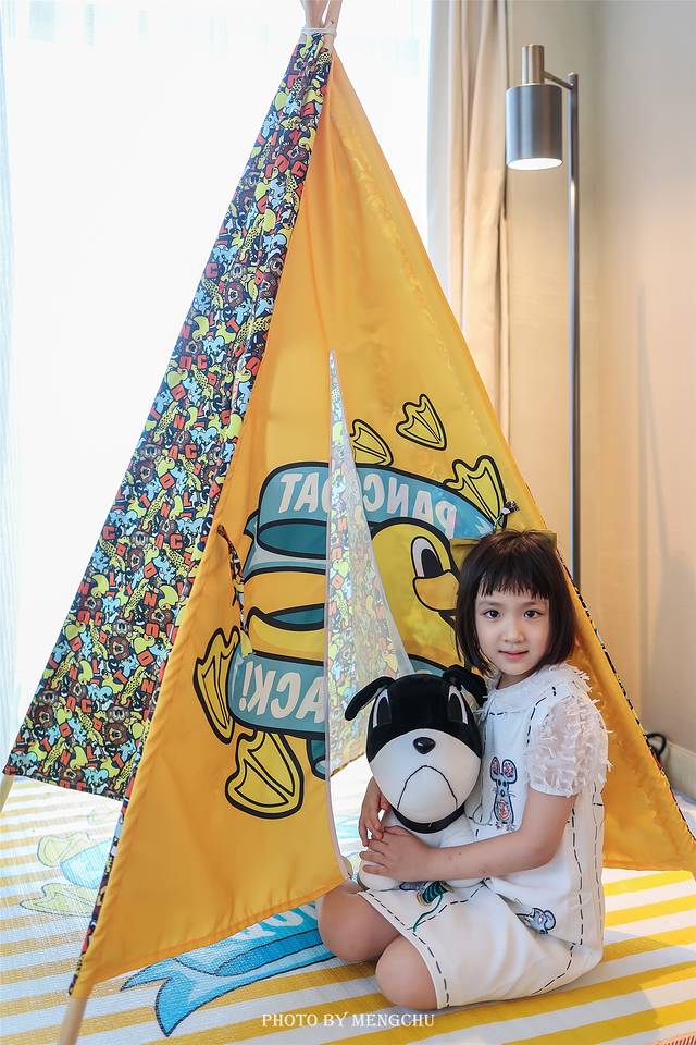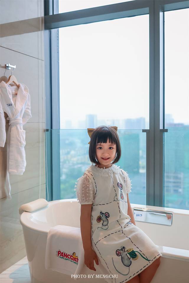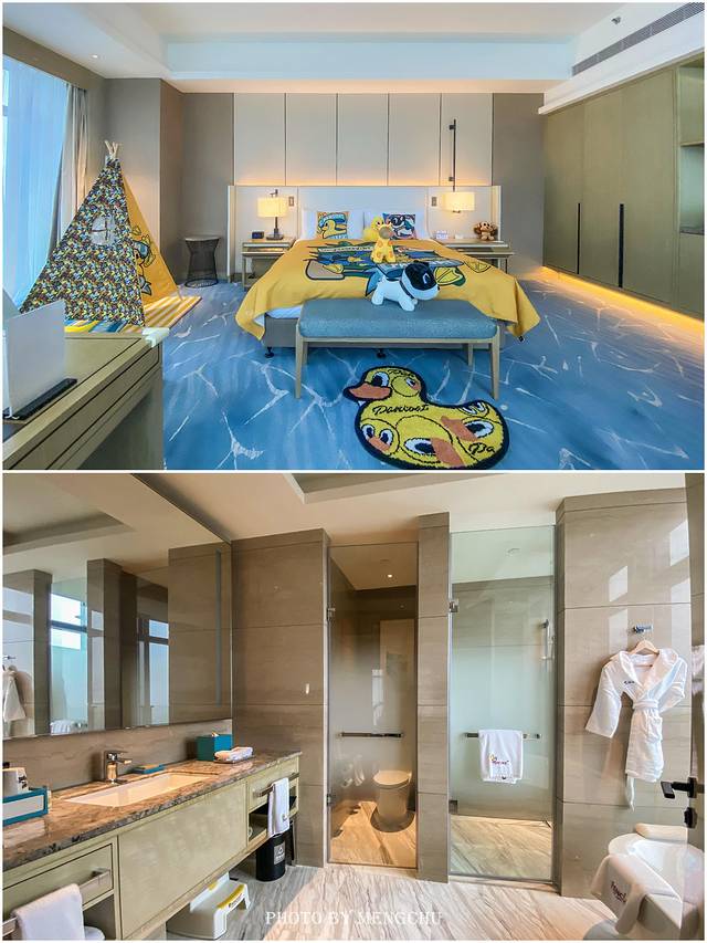 酒店装修风格简约大气,整体色调时尚柔和,门口的巨幅壁画生动展示了运河风光。这次带着小丫头入住了小黄鸭主题亲子套房,房间布置得童心满满,到处都是可爱的小黄鸭元素,还有滑梯和小帐篷,就房间里就可以玩得乐不思蜀。房间的视野非常开阔,超大落地窗将通州整洁干净的市貌尽收眼底;卫生间面积也很大,落地窗前的大浴缸可以一边泡澡一边欣赏夜景。