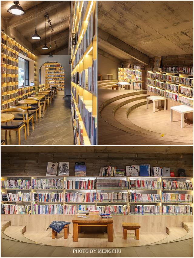 书院的一层是新书售卖区,高耸整齐的书架分类摆放文学、艺术、诗词、历史、国学等书籍,其中有一角书柜专门陈列了大运河相关的书籍,还有运河主题文创产品展示售卖;二层是图书借阅区,两边分散了几处下沉式的半圆形阅读区域,相对独立的空间设计,可以在这里享受片刻宁静。