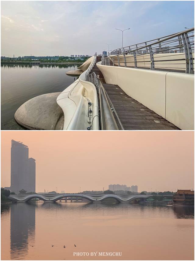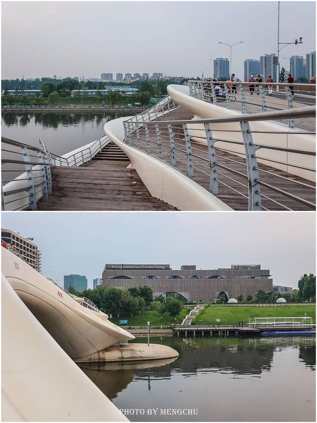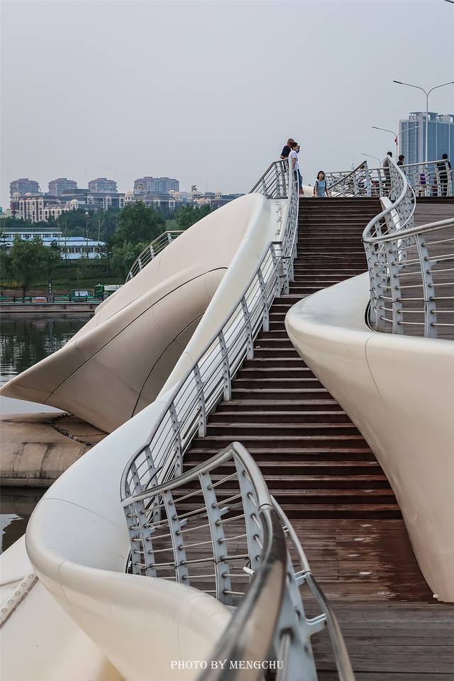 桥如其名,这座新落成的大桥以“荷”为主题,高低起伏的步道宛若荷叶的叶缘,展现了通州水乡区“莲叶何田田”的文化意境。