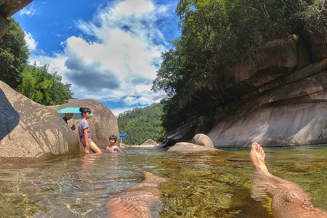 即使不能进入腹地,我们稍微靠近一些,远离城区,必定能凉快不少。同时,沿着溪边走,也能找到泡水的地方。这是孩子们最大的向往。玩水,就是孩子的天性。