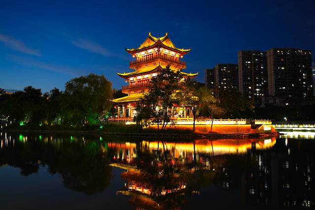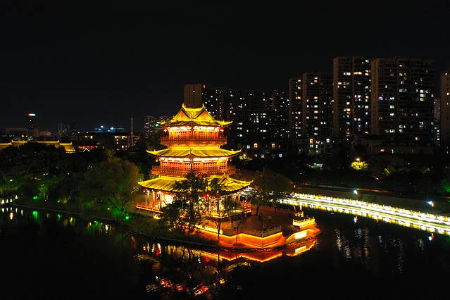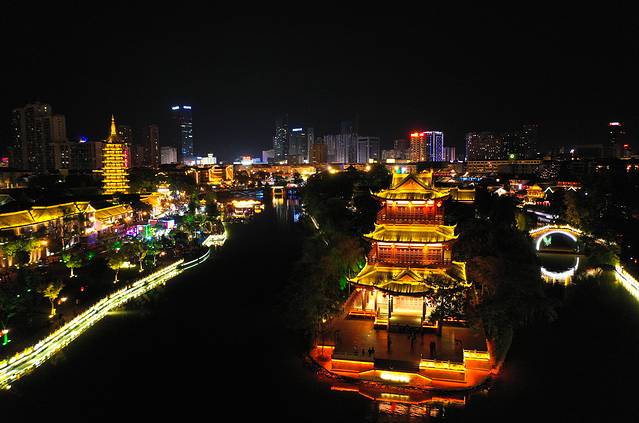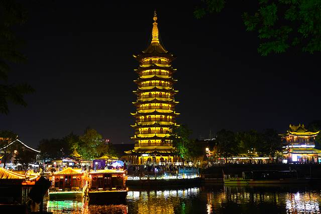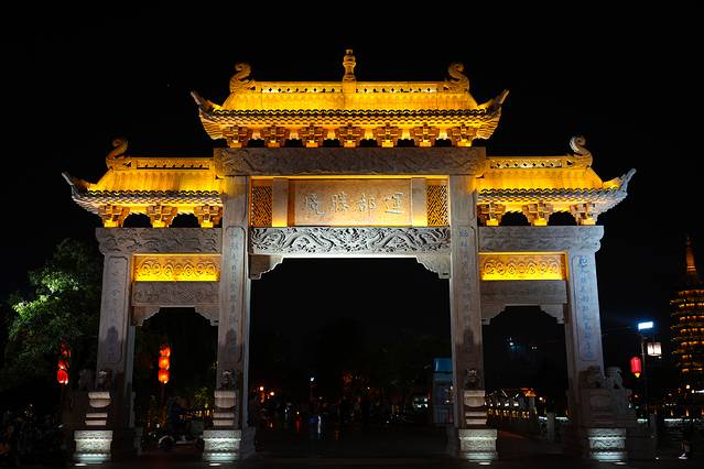 我是从牌坊那个门进来后,左手边对面就是御码头美食街,一到晚上的时候这里就变成热闹非凡,过了桥后左手边是去中洲岛,右手边是到国师塔方向的路。这里上次来过,但上次时间太赶了没有好好逛一下,一进来就能看到古色古香的建筑。就在桥头边上有有一个世界遗产很大的牌子上面写着“清江闸”三个字。右边就是国师塔,晚上灯亮起来的时候夜景很美。