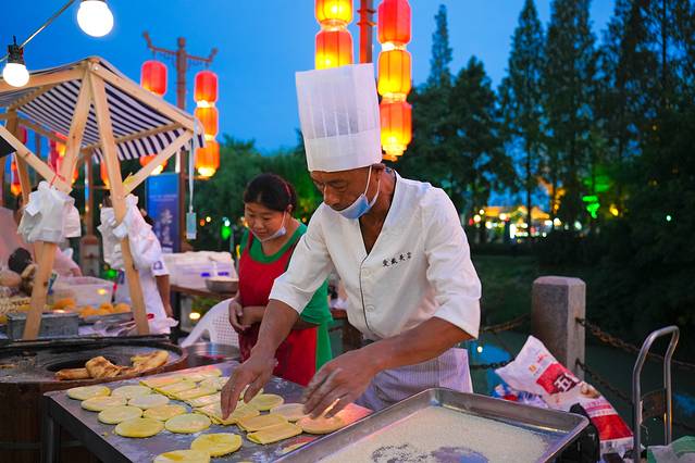 这次展会精心打造“香约运河”“戏游运河”两大片区,看到一位非遗美食的传承人,几代人都是做烧饼的,一代一代的传承下来,真的很难得。此次非遗展除了有可口的美食外,还有 江苏 省淮海剧团、 连云港 市淮海剧团等7个淮海剧团共同献艺。一边看非遗展,一边吃着非遗美食小吃,这样的夜晚真的是太惬意了。