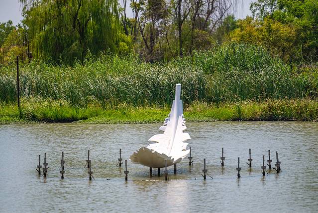 在景区大门的爱心拱门旁的湖边看到一个羽毛的雕塑,细看上面的文字,才知道沔阳小镇是千里送鹅毛典故发生地。《青藤山人路史》记载“将鹅贡唐朝,山高路远遥。沔阳湖失去,倒地哭号号。上覆唐天子,可饶缅伯高。礼轻人意重,千里送鹅毛。”