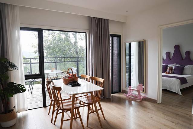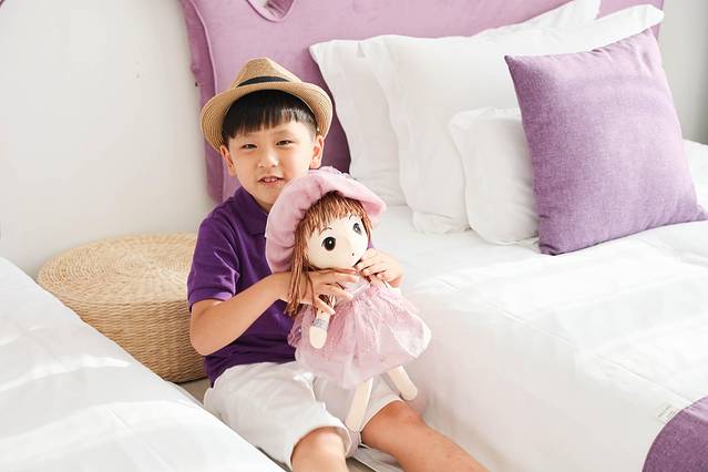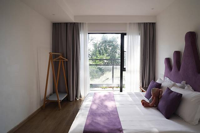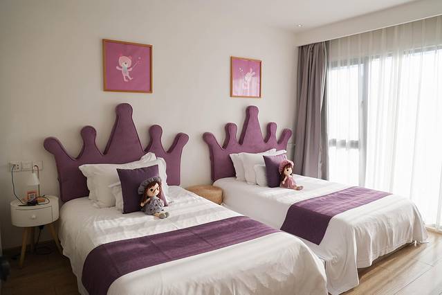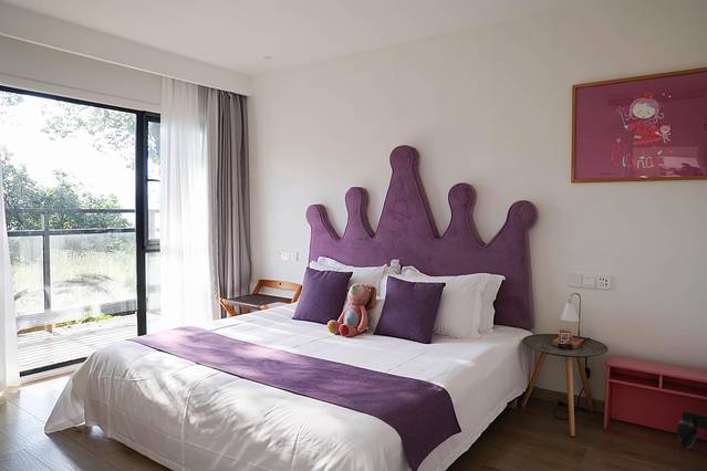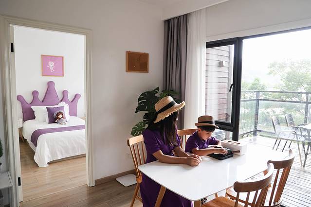 别墅有两间卧室,中间是客厅,一家三口入住绰绰有余,无独有偶,房间内饰的紫色主色调和我们当天的紫色亲子装不谋而合。