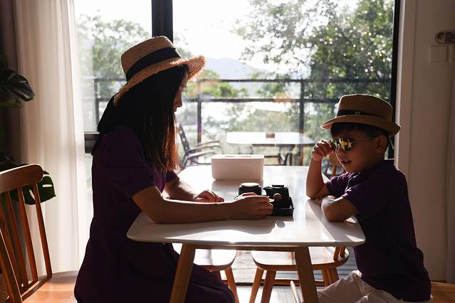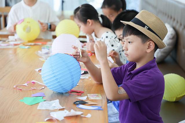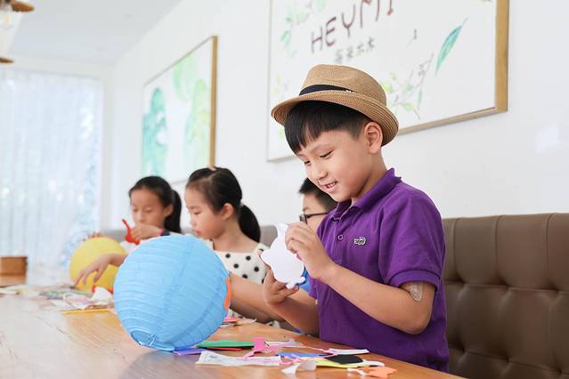 去的时候正值民宿在搞迎接中秋节的主题手工活动,吸引了成群的孩子坐在木桌旁搞“艺术”创作,元宝也迫不及待火速参与其中。
