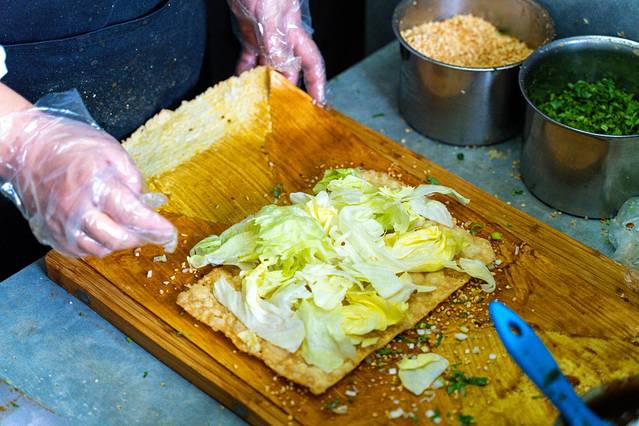 微温的煎饼拿在手里,闻起来特别馋人,可以清楚看到里面层层包裹的馅料,超满足。