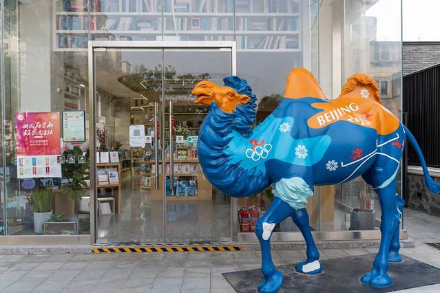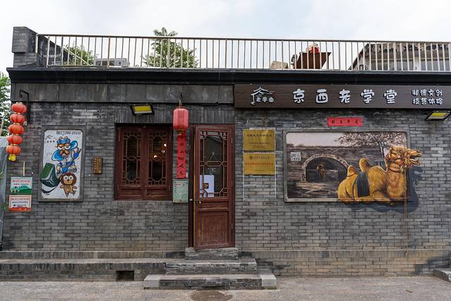 模式口大街入口,一座砖木装饰的玻璃房,几只骆驼雕塑或立或卧环绕着,台阶下的青石镌刻着“京西古道”四字,古朴与现代相结合,分外雅致。