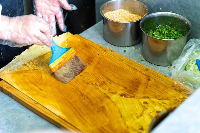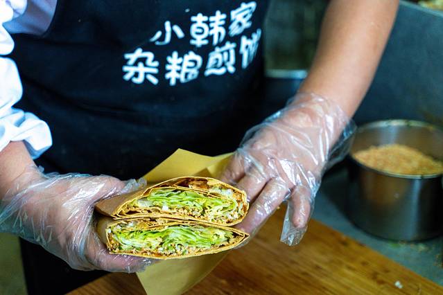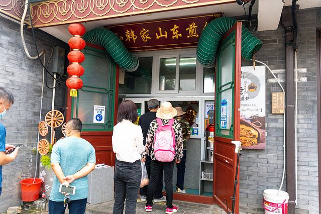 在法海寺炸糕旁边,还有一家网红 山东 杂粮煎饼,由于这两家店正好在前往法海寺的上山岔路口,所以仅仅吸引了周边居民光顾,还成了法海寺乃至模式口大街游客的尝鲜选择。
