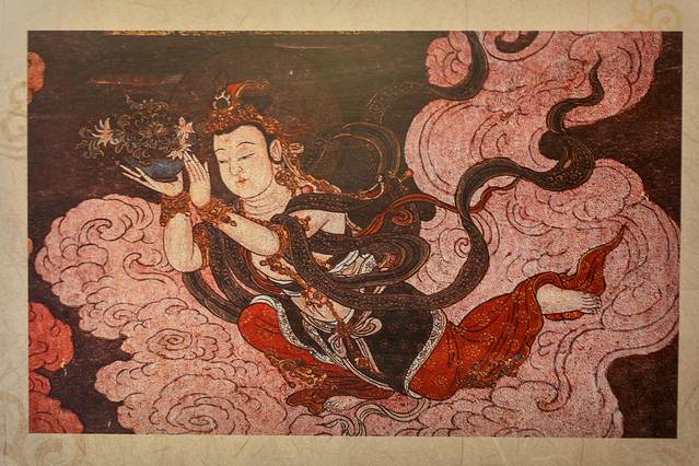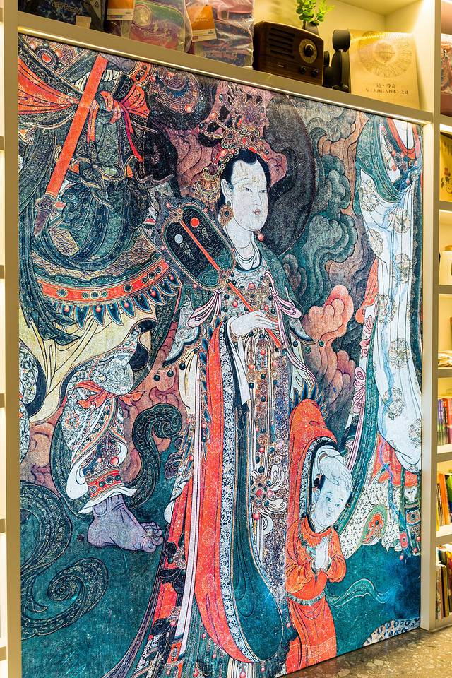 转过图书区,是阅读区和吧台。原木长条桌椅通贯,墙面配一幅 敦煌 的壁画。店并不大,幽雅而清丽。如果喜欢看书和拍照,这里不可错过。