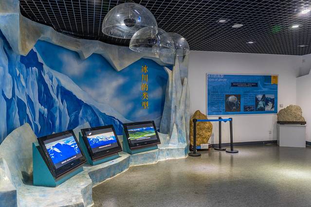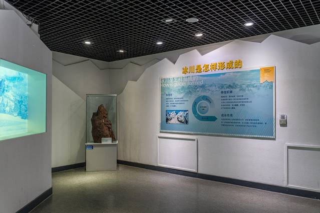 展馆一共有两层,一层展厅包括了序言、冰川知识、冰川擦痕保护区和地球演化与第四纪典型冰川地貌,同时设有多功能厅,可以观看和冰川有关的科普影片;