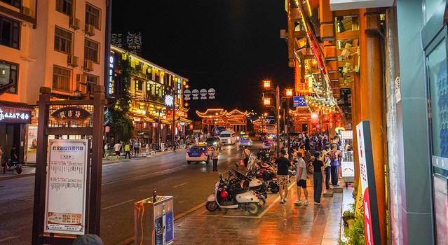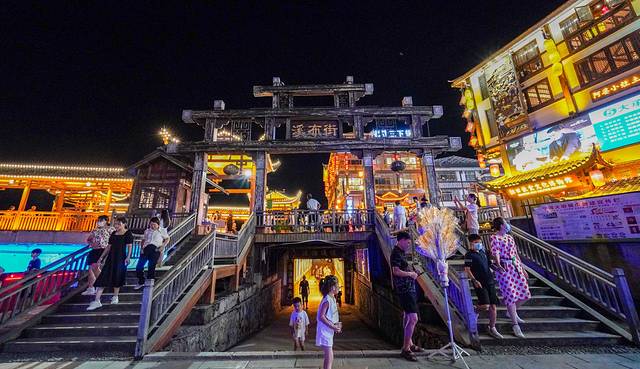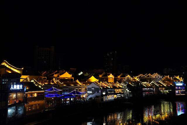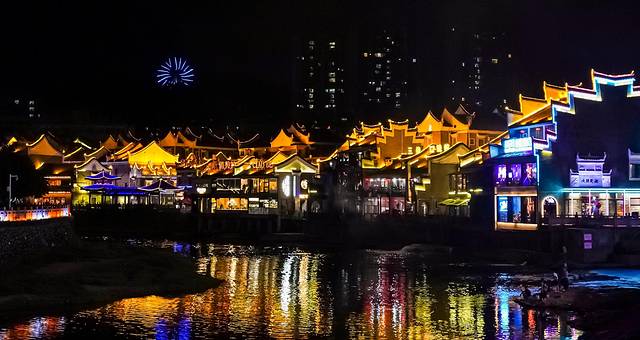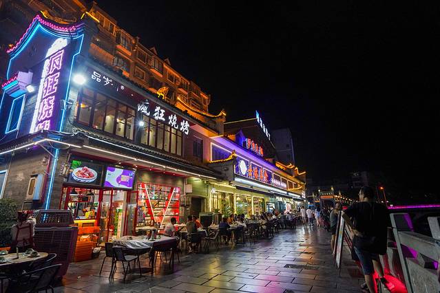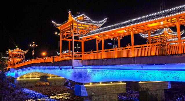 或许是因为临近索溪河的缘故,让人感觉溪布街的夜景有点江南水乡的感觉,跨河而建的风雨廊桥、依河而立的吊脚小楼、绚丽的酒吧街、热闹的小吃街,共同构成了这山野之间的繁华夜生活!