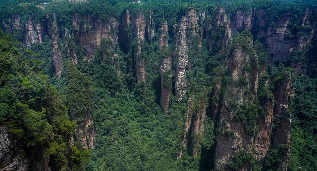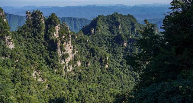 【天子山】其实张家界的景色看多了也会觉得有点重复,比如天子山的这一片千峰林,看上去与袁家界的岩峰林就长得很像,整体来说天子山的山峰高度要低上一截,可能是因为此地处于河流下流的原因,遭受水蚀更严重一点;但也正因为如此,所以天子山的山峰虽然与袁家界的景观很像,但细细去看却更为震撼。