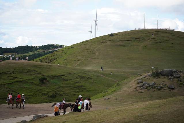 在仰天湖草原风景旅游区内,还有一片非常特殊的风景,它就是由数百个风力发电机组成的“云海风车景观带”,高耸入云的风力发电机沿着山脊蜿蜒数百公里,犹如一条条巨龙腾空远去,特别是早上起云雾的实惠,风车在云海中旋转,真的是十分壮观;重点是这种大国基建与景区的结合,在国内外也是比较少见,还是很有特色的吧!