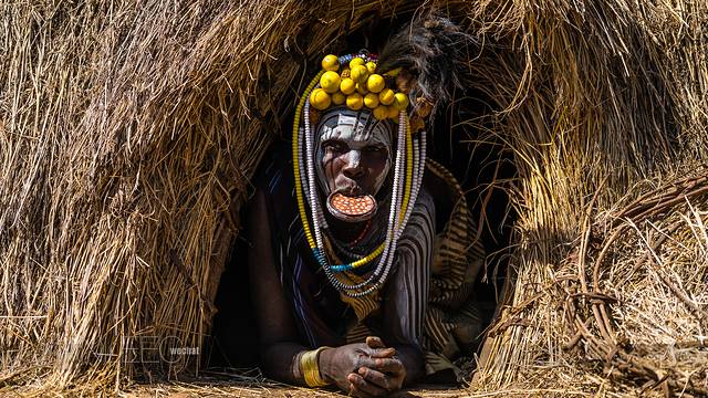 摩西族人mursi视乎从没听说过“埃塞俄比亚”这个他们所属的国度的名字,或者是毫不在乎。直到今天,当我们翻山越岭深入马果mago森林时,他们依然保持长久以来的生活状态:男人们捕杀野兽,女人们在嘴唇里镶嵌大盘子。唯一的变化大概是:当游客到来时收费摆拍。