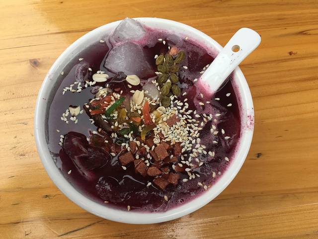下司古镇手搓蓝莓冰粉一碗(10元),蓝莓冰果和红糖水一起打成的汁,夏季爽翻的冰饮。
