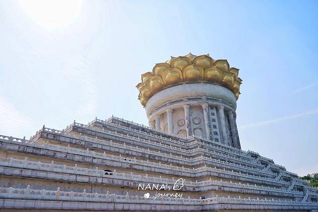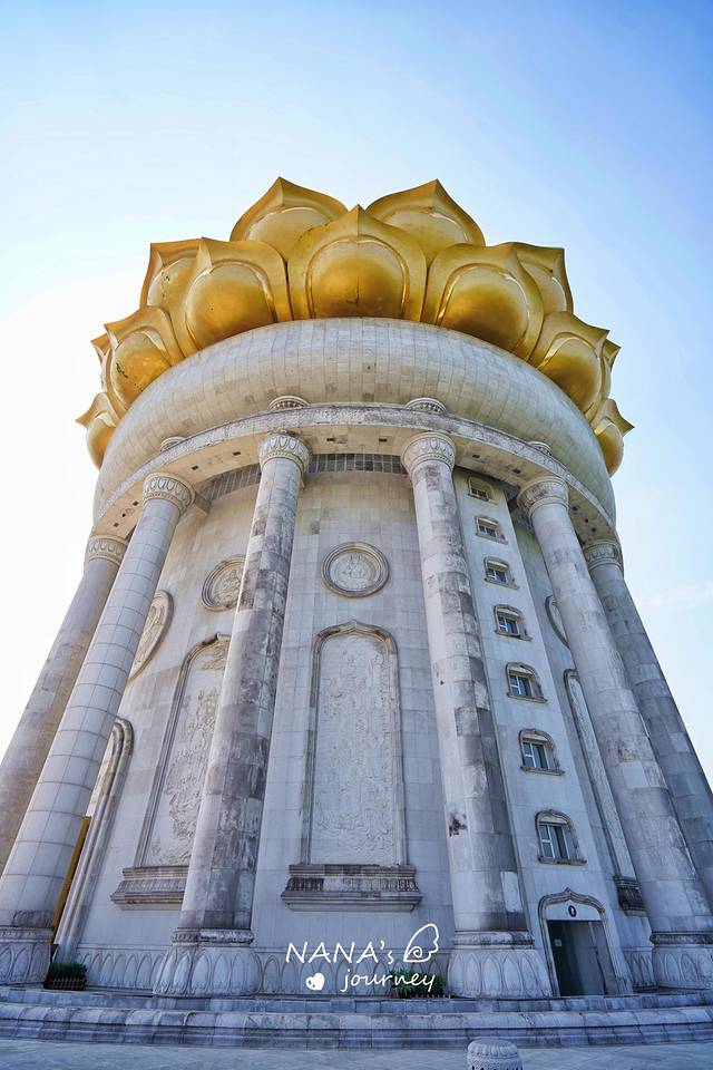 车终到山顶,纯白色的建筑和金色莲花宝顶一下子映入了我们的视线。建筑之美,让人赞不绝口,真有“ 云顶 天宫”之感。