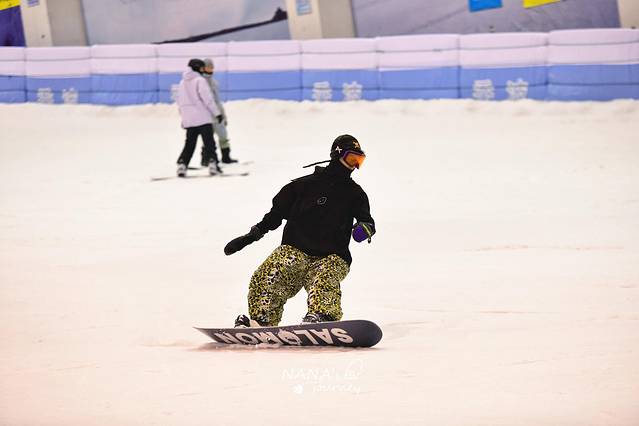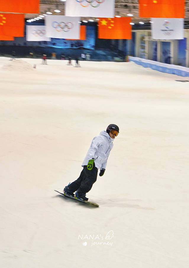好了,来说说滑雪这件事,第一次滑雪,就算有滑板经验,也不会直接到滑雪的这一步,最开始要学的是刹车,也就是推坡,学好了刹车才能更好更安全的单板滑雪。推坡也是一门技术活,对初学者来说,要控制好半蹲角度和腿部的用力,来达到平衡,有几次我都差点一放松就滑出去了!在教练的耐心指导下,推坡我也算是入门了吧?!