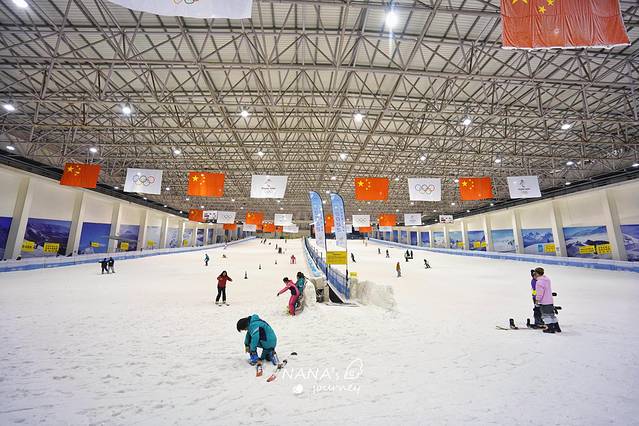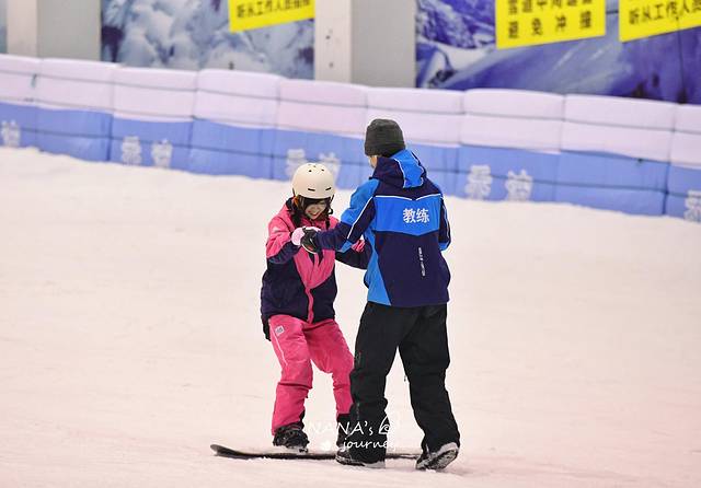 领好滑雪服、鞋子、头盔、手套、板,就可以开始冰雪运动了~雪场一共是两条雪道,右手边的雪道还有障碍可玩自由式滑雪。