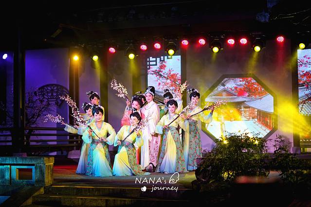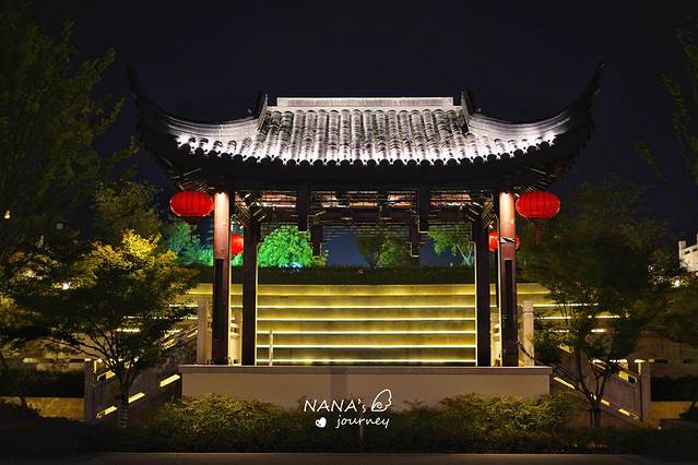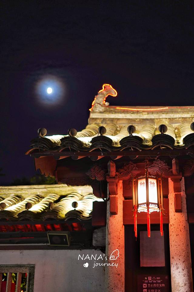 近满月,整个园林在灯光与月光的包裹下,温柔又典雅,走在回廊之中,仿佛来了一场夜晚的时光穿越。