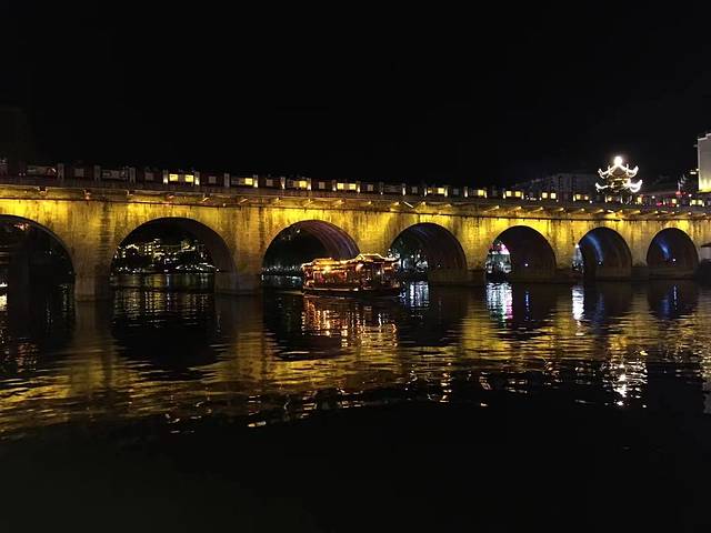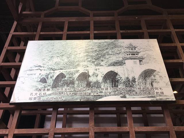 为七孔青石拱桥。桥中央有一个三层三檐八角攒尖顶楼阁建筑,被称为"状元楼"、"魁星阁"。据说此楼建成十年后,贵州果然破天荒地出了两个状元。