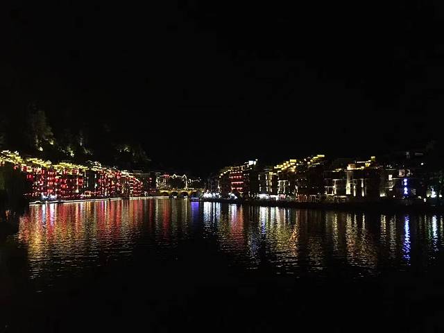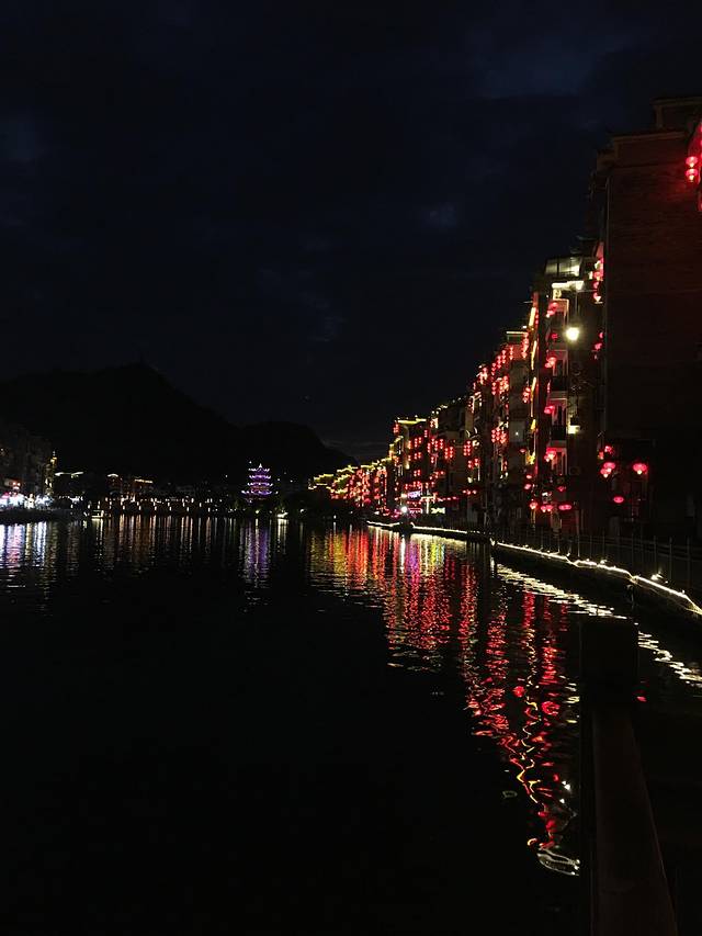 舞阳河上,夜幕下的古城镇远流光璀璨,夜色醉人,如同一幅美丽的画卷,如梦如幻。