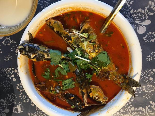 酸汤角角鱼(黄骨鱼)+绿豆冰粉+冰豆浆合计100元。吸吮完角角鱼,酸汤泡饭也是让人回味无穷。