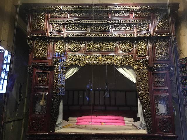 这是镇宅之宝——五层镂空雕金丝楠木床,现在价值一亿多人民币。整张床的设计按照当地苗族风格设计,像苗族姑娘的头饰一样。工艺已经失传,200多年前,木匠就在这个房间里花7年时间才制作完成,每层花纹都不同,麒麟凤凰雕刻其间。