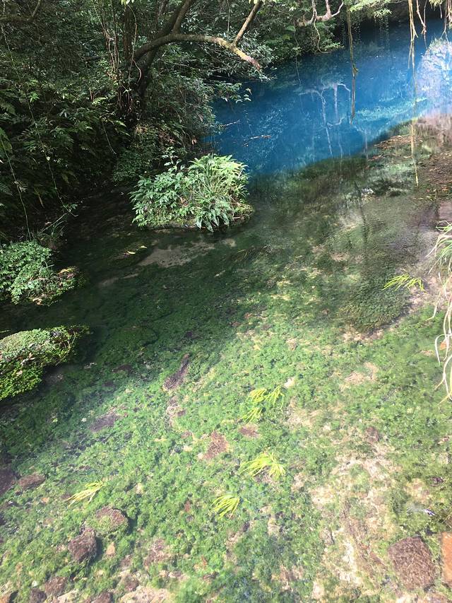 上面就是铁溪风景区溪水的源头——平潭,带着好奇出去时问工作人员才知道:原来这是地下水,所以面积不大的潭水得以源源不断的往下面输流。平潭的潭水究竟有多深呢?专门派人浅水下去25米,还未见潭底。让人好奇的是整个水潭竟然是湛蓝色,带着大海一般的深邃,可为什么这样,工作人员也无从解答。