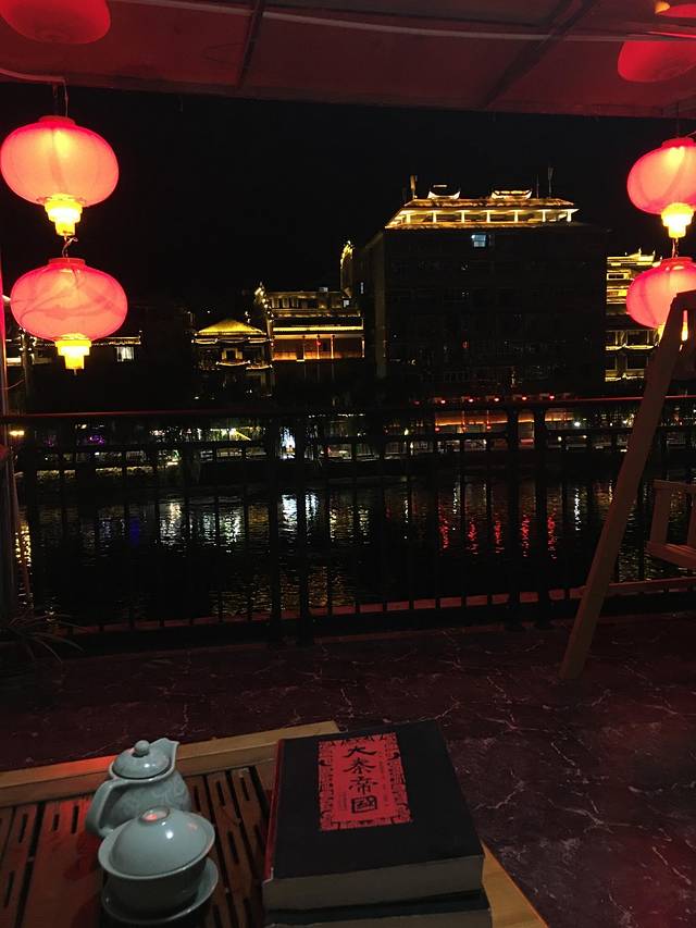 晚上八点钟回到酒店,在临江房的观景大阳台上,泡杯茶,翻翻《大秦帝国》;凉风习习,时而坐在摇椅上看着舞阳河对岸的夜景,一解白日在古巷中穿梭的劳累。我这份悠闲自得,还引来了船上人的拍照。