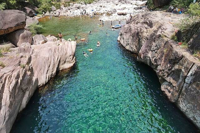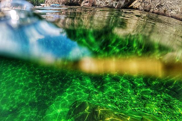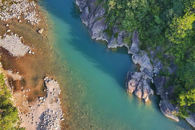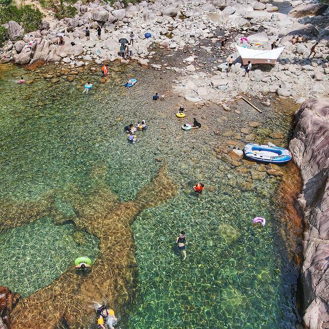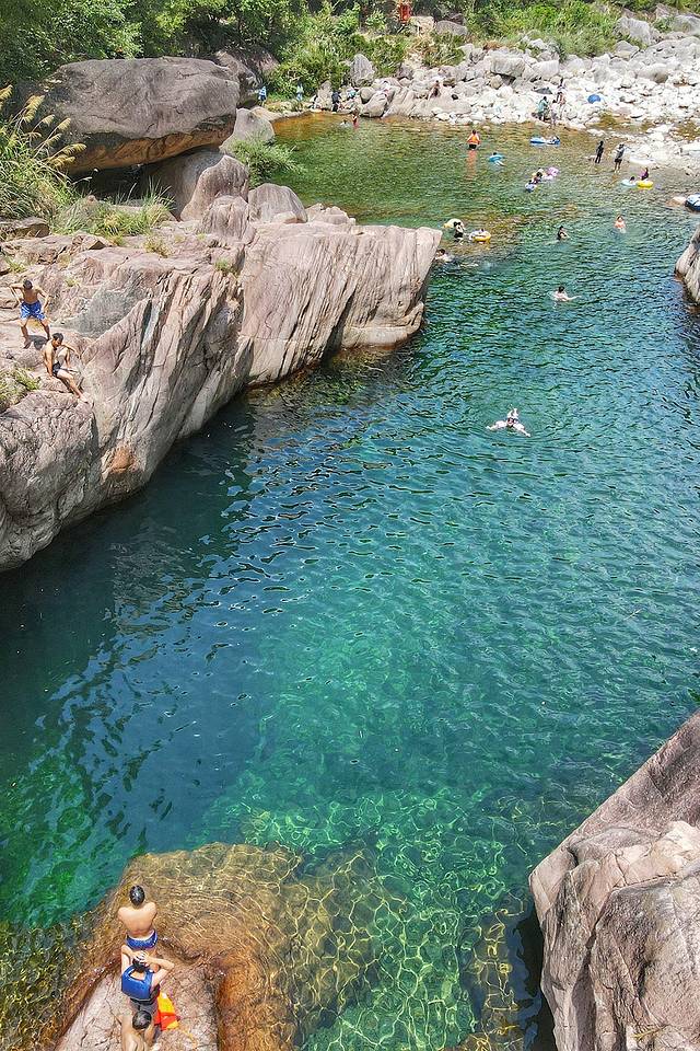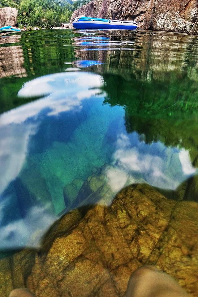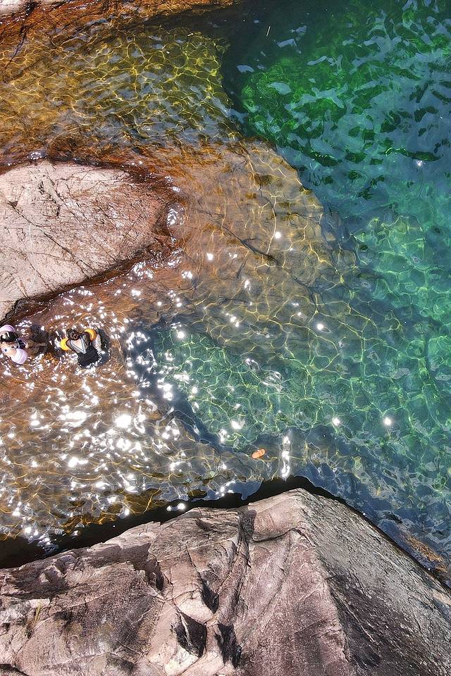 潭边上的水域很浅,小朋友跌倒也容易站起来。深潭,有数米,但确实清澈见底。