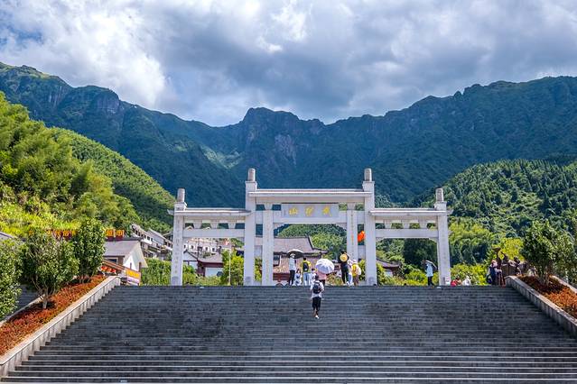 下了观光车,就来到了武功山的主峰白鹤峰山脚下,需要在这里乘坐缆车。这里有刻着”武功山“的牌坊,过了这里就算是正式进入武功山了。