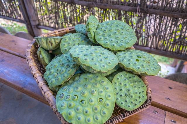 跟着当地人带着簸箕去采摘莲蓬,也是第一次尝试生莲子,香脆可口还蛮好吃。