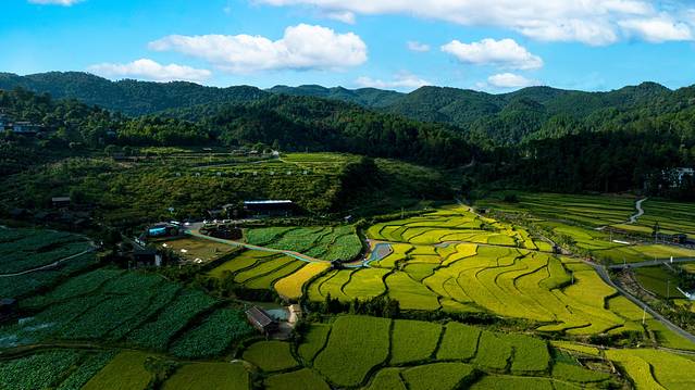 吉内得国家稻田公园位于萍乡市莲花县,是一个小众的田园村庄。这里满足了对乡村生活所有幻想,金灿灿的稻田、彩色屋顶的民居、层层叠叠的梯田,还有小木屋前盛开的荷花,仿佛走进了梦幻的油画里。