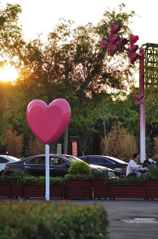 比如街口心形的红绿灯,是好看的粉色,少女眼中融化爱情的颜色,有点浪漫有点梦幻,也是我最喜欢的颜色,因为我同样是个爱做梦的浪漫女孩儿。