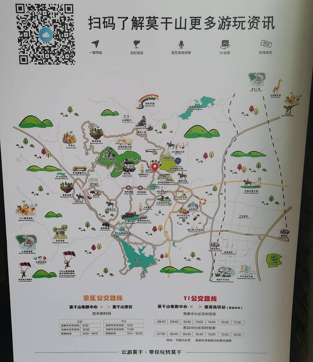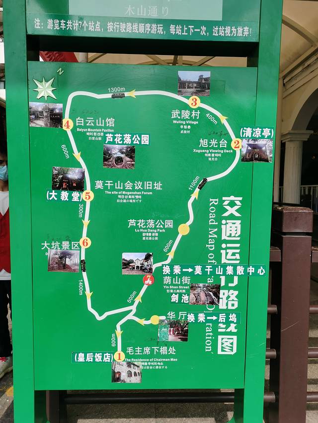 莫干山风景区的景点整体来看就是一个圈(如下图),除了剑池以外,各景点都有上下车的站点,可以通过乘坐摆渡车去往不同的风景点。这个票是需要单独买的,买票的地方就是刚刚下车的荫山街换乘中心,微信扫码买票即可。下图中的数字,就代表摆渡车依次去往的景点,你可以自由选择在哪里下车,在不同景点也可以自由选择上车,不限次数,只要你愿意排队就行!