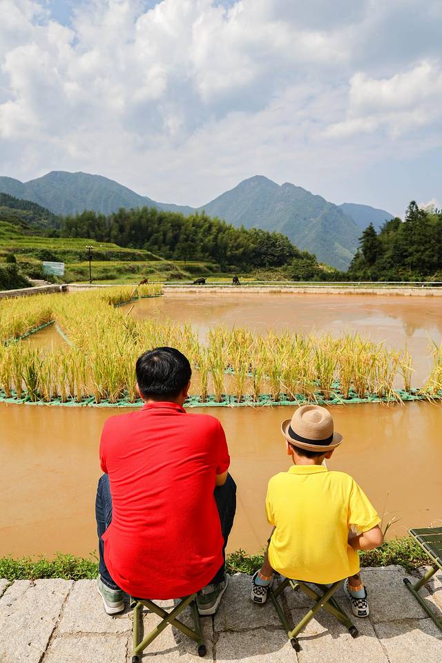 带元宝来到丽水云和,很大的一个考虑是回归自然。梯田公社就是个可以体验垂钓、田间捉鱼、植物采摘、喂养小动物的综合性亲子学农基地,坐落于云和梯田景区九曲云环区域,面积约430余亩,非常大。