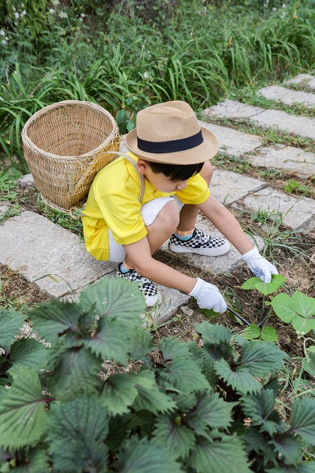 后来背着小竹篓,拿着小镰刀,跟着基地的工作人员一起植物采摘,认识了紫苏、豆角等不少蔬菜。