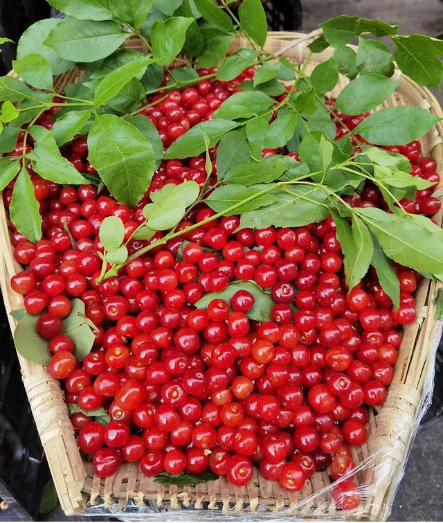 每当樱桃成熟的季节,在五金店与百货公司之间拐角路边就能见到有人售卖。樱桃装在篮子里,上面用新鲜的树叶子盖着,红色透亮的果子特别诱人,路过的人不管买不买都会多看几眼。