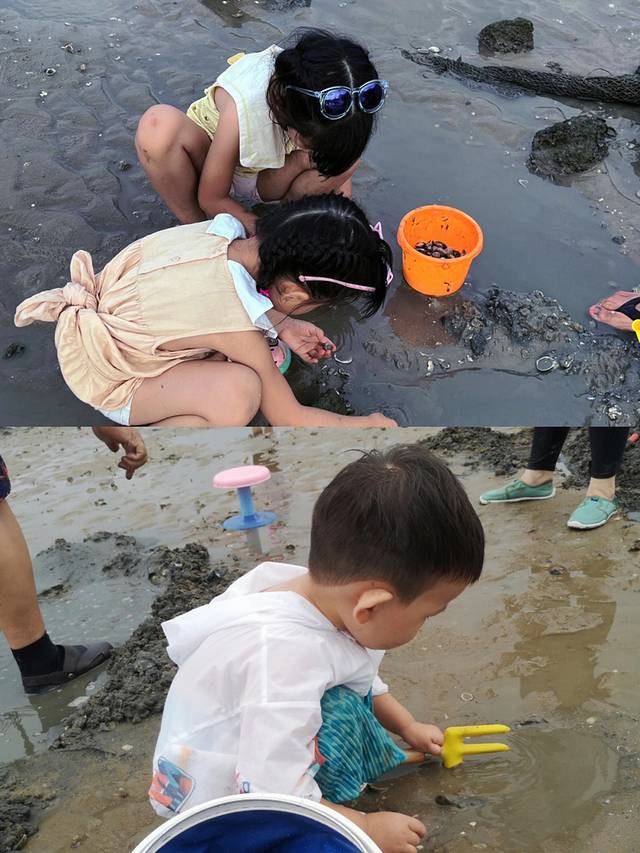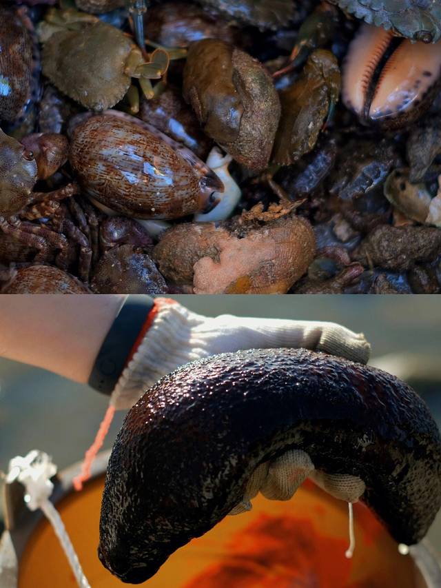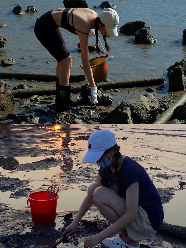 在退潮自厉害的时候走到海中央的小山脚⛰那里,可以搬开石头堆🪨,里面有很多🦀螃蟹哦,捡到最多的还有海胆、贝类、花甲、沙虫,可以观察一下一些专业选手是怎么操作的🤪