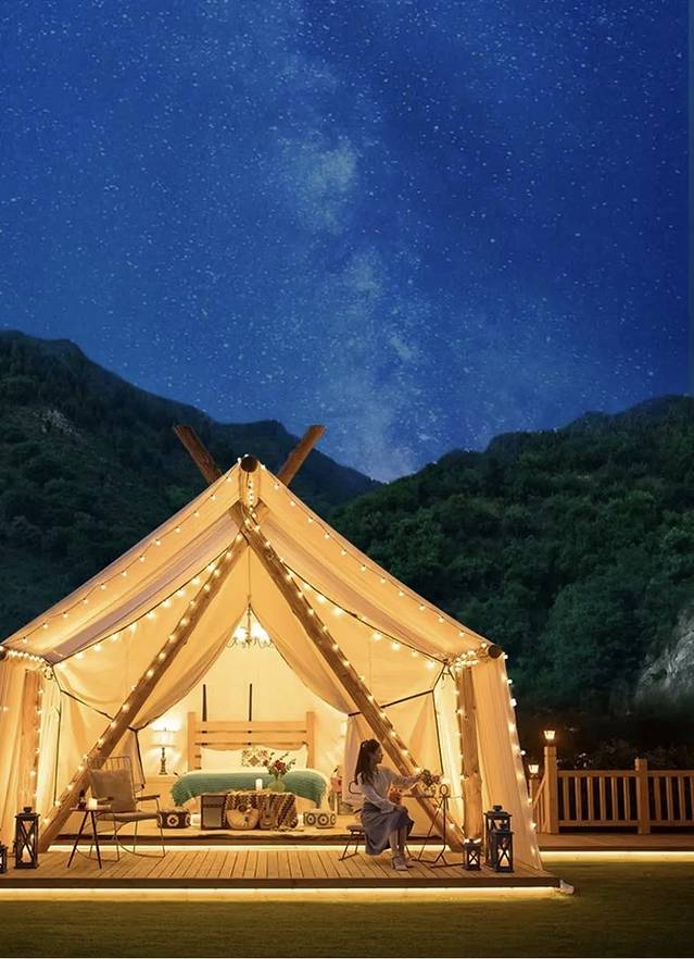 星光点点,九如山的夜晚同样醉人。如果白天没玩尽兴,晚上可以住在“跑男”同款的红颜容木桶酒店,每个“木桶”都配备一个独立小院,夜观浩渺星空,看繁星漫天,放空心情,沉醉在这份浪漫之中,静享童话山景。