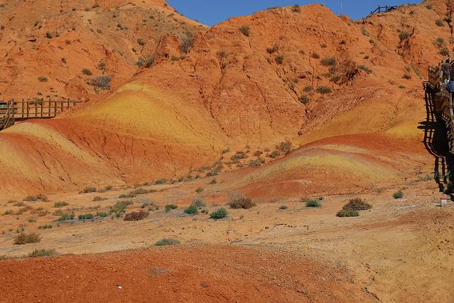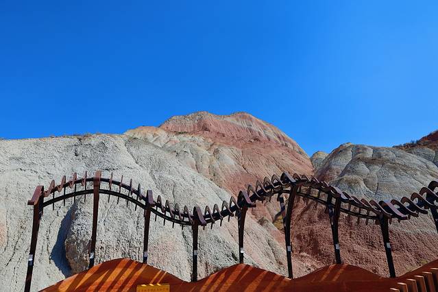 坐上景区观光车来到观景平台,映入眼帘的是经过1亿5千万年才形成的丹霞景观,当它出现在我眼前时,我被这种像画出来的山体所震撼,彩色线条彰显出自然力量,在这里除了能欣赏到七彩丹霞外,还能看到像中国水墨画一样的灰黑色丹霞等多种多样的丹霞地貌。