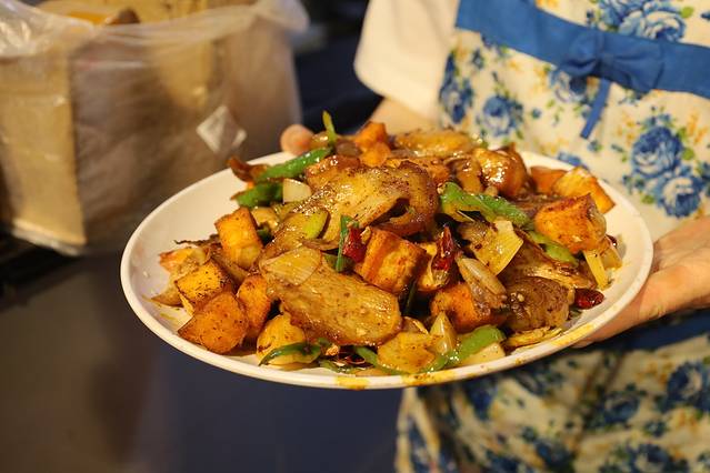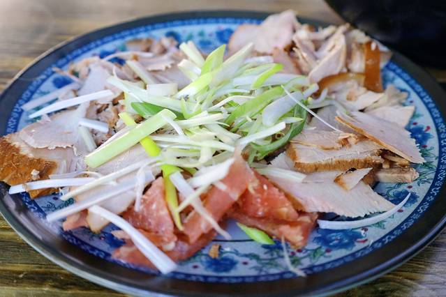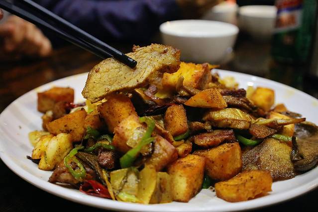 我们最后选择了这个叫“永昌坑锅子”的美食,是金昌的非遗项目也是当地的特色美食,就是猪身上的各部位熟食切片,加馍块还是饼子块炒制而成,好像我记得店家说是炒这个的厨具很特别,但它确实很好吃很香不腻。