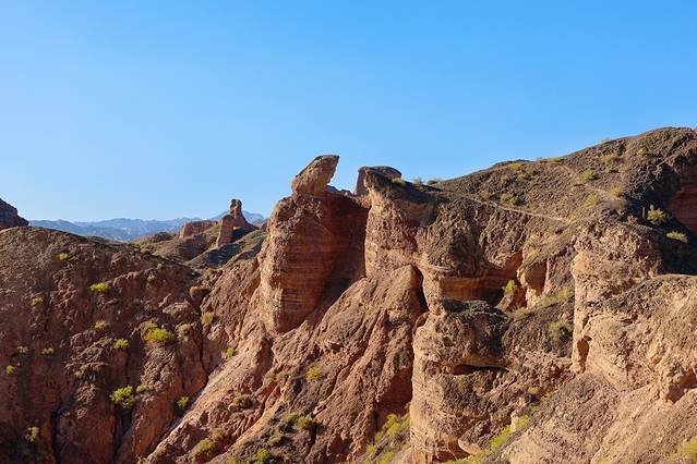 当乘坐景区车辆进入景区时会觉得很普通,但当车辆到达观景平台时,你就会眼前一亮满眼看到的山体都是红色砂砾岩,呈现各种形状,敬畏大自然的创作力,经过亿万年的风吹雨淋才形成这样的地质奇观。