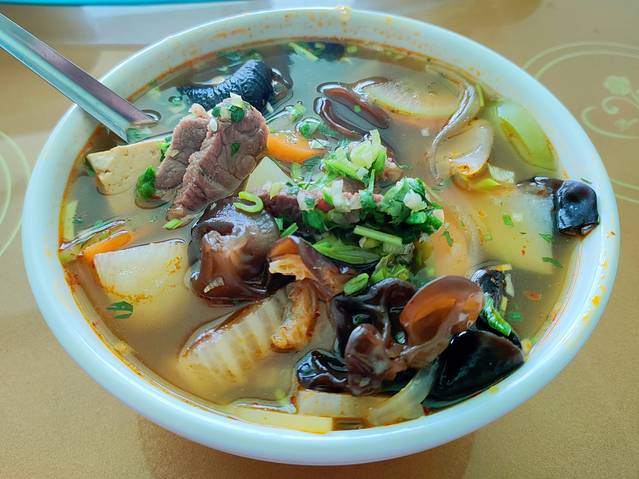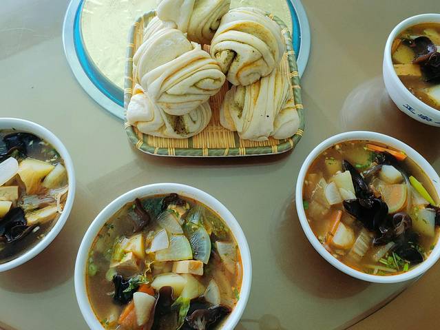 要推荐一下这个汤,虽然我忘了啥名字,但它太好喝了料还丰富,里面有木耳、土豆、豆腐、西葫芦、胡萝卜等等好多种蔬菜块,最重要有实实在在的牛肉块配着咸花卷,喝起来简直不要太满足!