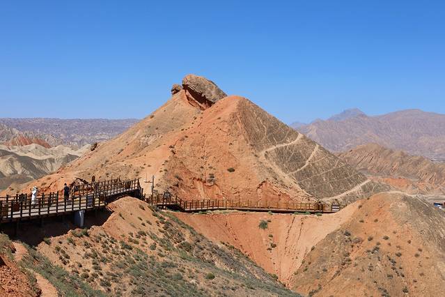 乘坐观光车进入景区内,你会被各种造型奇特的丹霞崖壁所吸引,经过亿万年的风雨冲刷才形成这种地质。登临观景平台远望你可看到连绵不断的石墙、 石柱 、尖峰等地貌形态,景区也为这些象形石起了非常形象的名字。