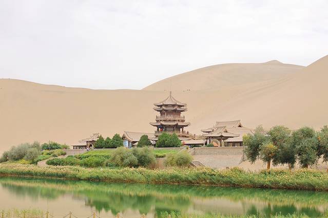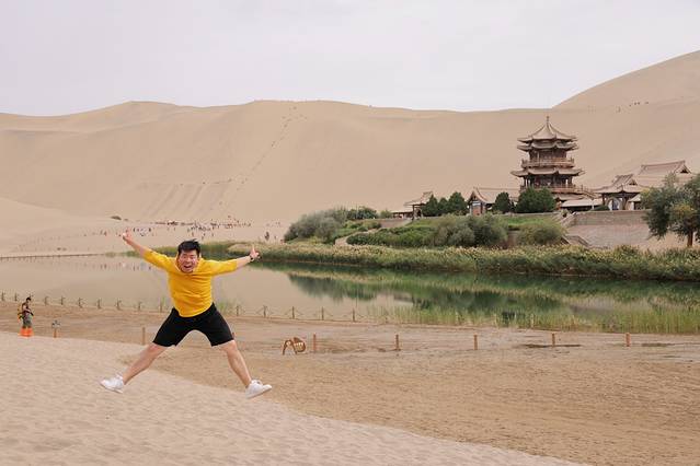 没错这就是我们此次行程的最后一站了!走完五色沙漠我们就要解散各奔东西了,最后还是感受了一下大漠沧海,山中有一泉名为“月牙泉”,沙漠山在风吹下不断变化着位置,但它永远不会淹没掉月牙泉!